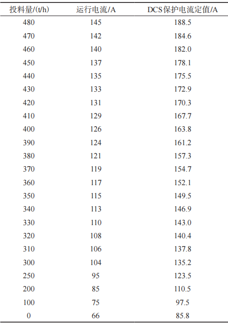 按6月10日晚故障情況做驗證,當(dāng)晚投料量477t/h,對應(yīng)關(guān)系表中480t/h,保護電流188.5A,延時2s。